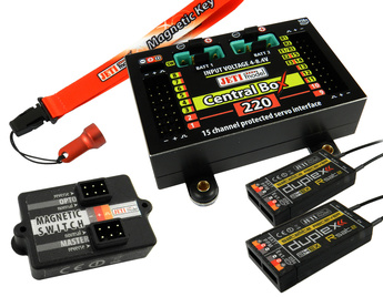 The Central Box is a switchboard designed for the complete management of servos in a model with an emphasis on safety. The Central Box 220 have a unique design that provides overload protection at each servo output. The Central Box can manage up to two batteries and fully supports the JETI EX telemetry system. Up to three receivers with serial (PPM, EX Bus, S.BUS, UDI) output can be connected to the Central Box 220. With JETI DC/DS transmitter, the full potential of the Central Box can be used, such as an easy way to configure the Central Box, EX telemetry, and very fast servo response.